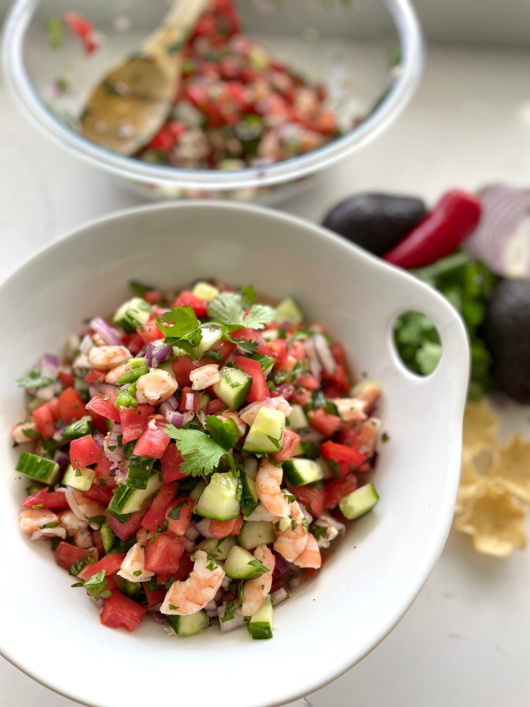 This delicious Mexican Shrimp Ceviche is easy to throw together, super refreshing and perfect for a summer pool party. All you need is shrimp, tomatoes, onions, cucumbers, cilantro, and fresh citrus juices to make the perfect appetizer or light meal. Just make sure you let it marinate for at least an hour before serving – that’s when the magic happens. Serve with your favorite tortilla chips or crunchy tostada, and enjoy!