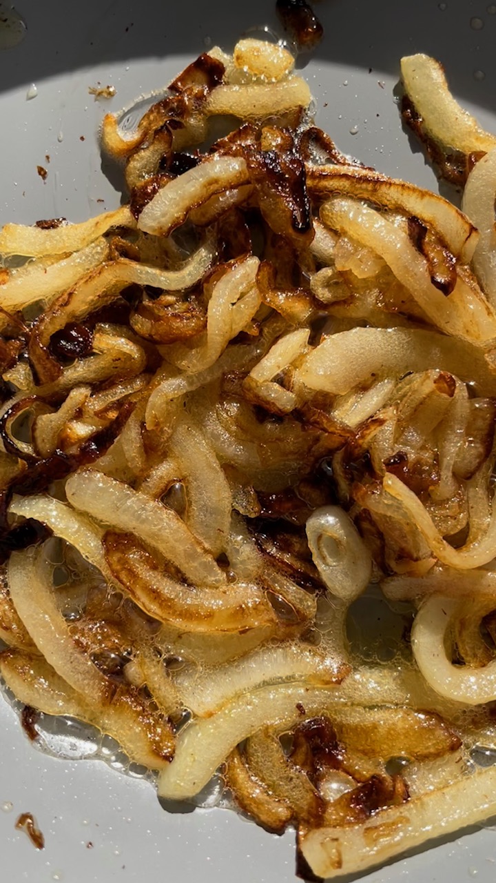 Thinly slice the yellow onion into half moons. Add 1 tablespoon butter and 1 tablespoon oil to a hot fry pan and add your onions. You want to cook on high stirring frequently for about 10-15 minutes until they caramelize, turning brown and soft. Reduce heat if they are sticking or getting too brown. Remove the onions from the pan.