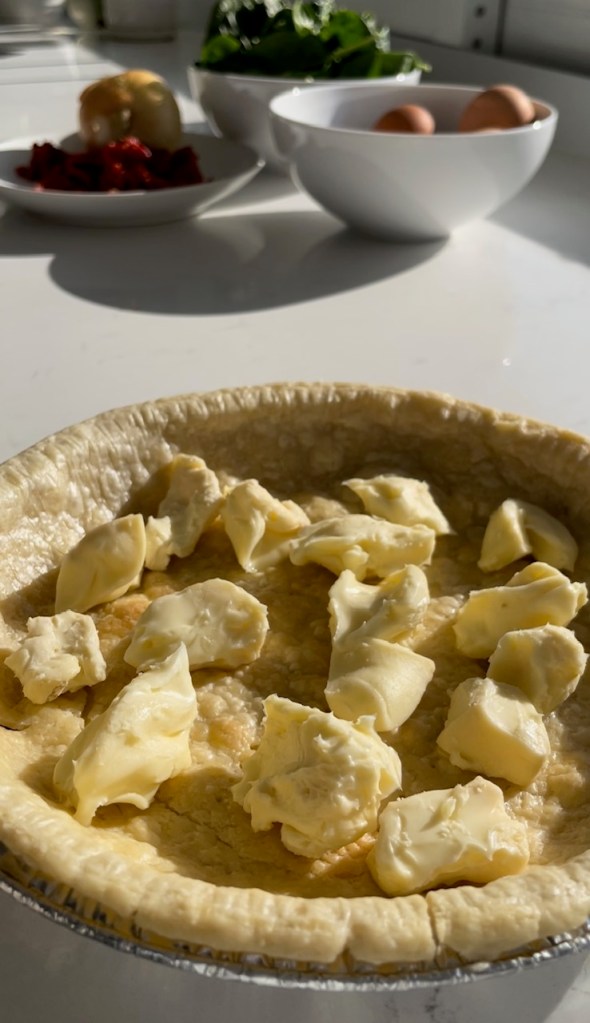 Remove the pie crust from the fridge and layer in your ingredients starting with the Brie cheese, followed by caramelized onions, sun-dried tomatoes, spinach and finally the egg mixture.