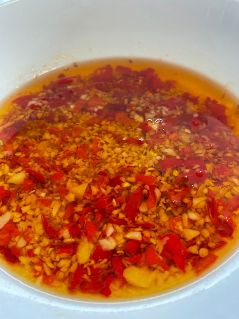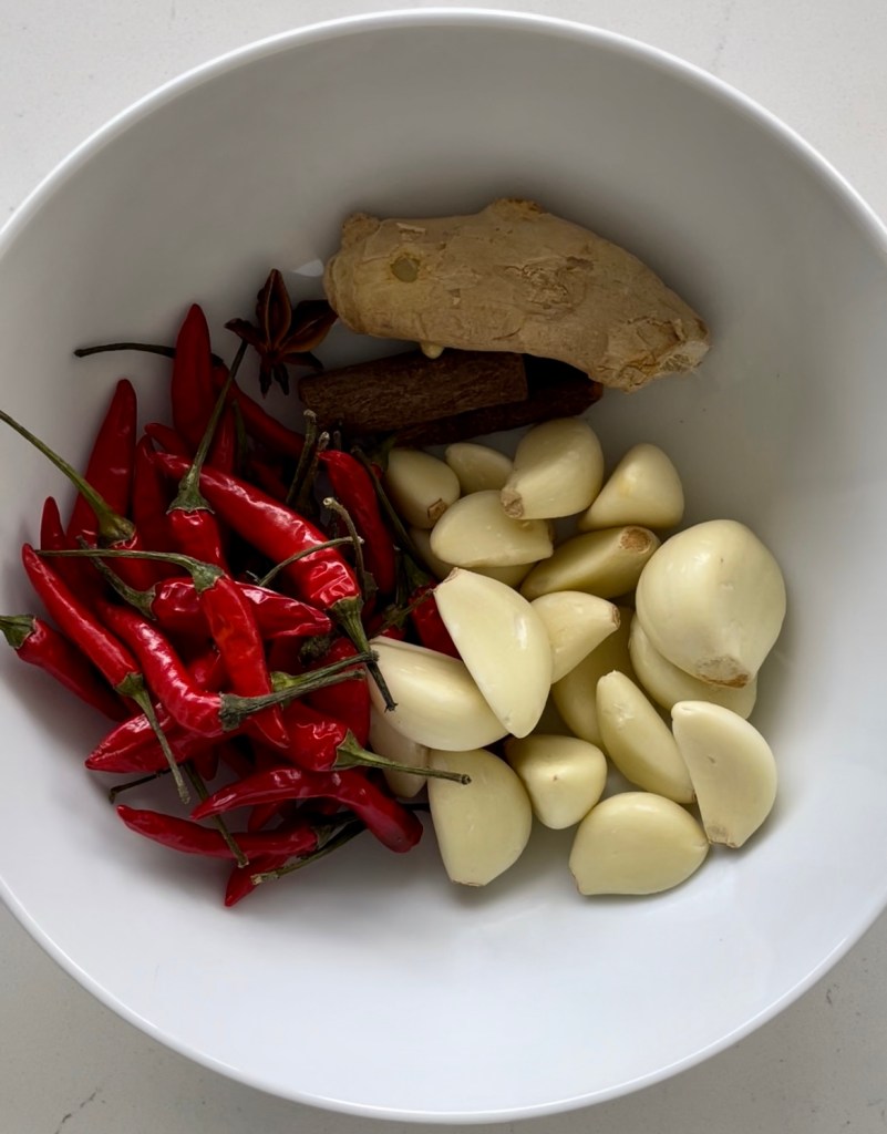 Chop chilis, mince garlic and peel and slice ginger. Add to a heat safe bowl along with optional flavorings.
