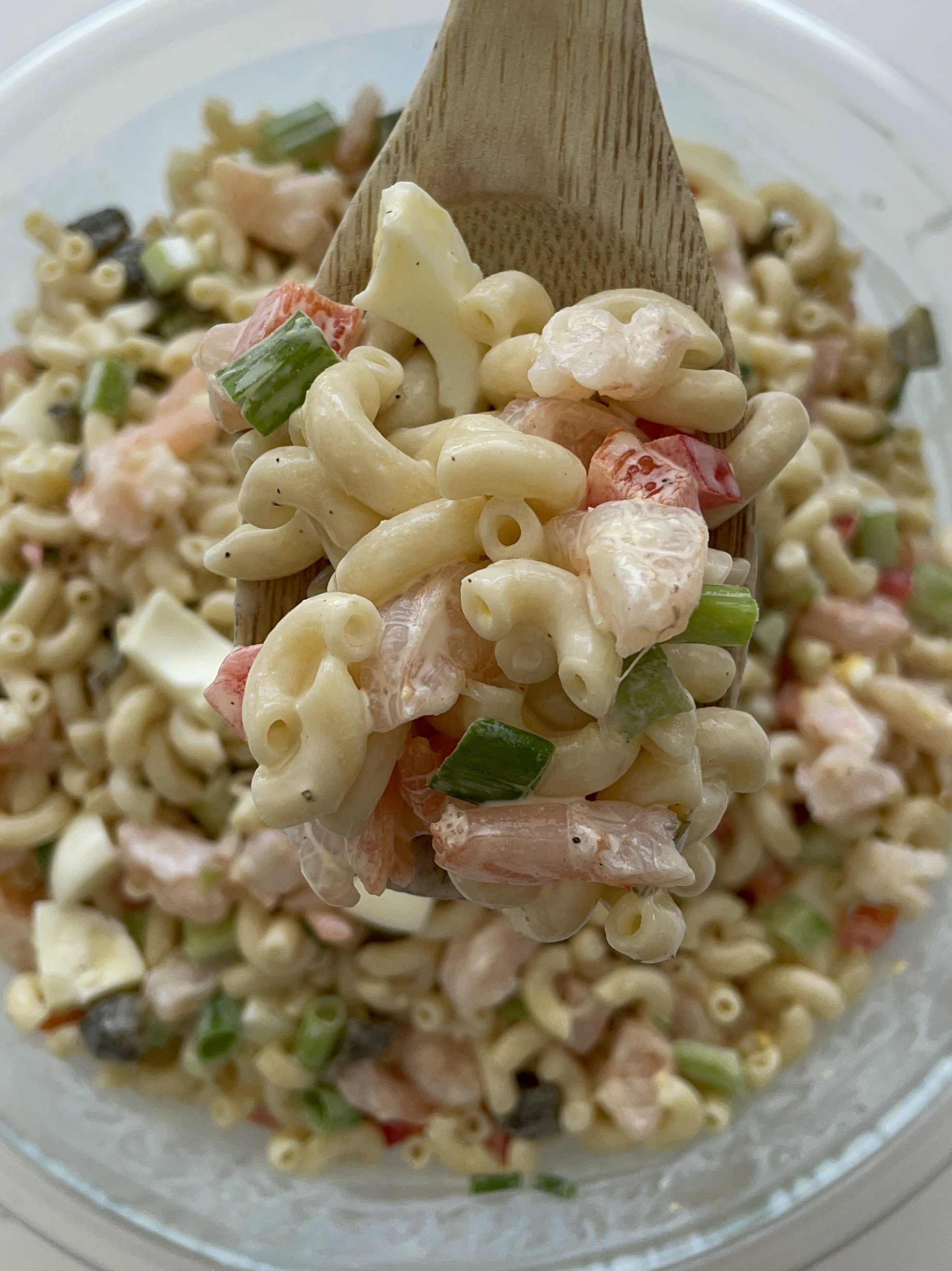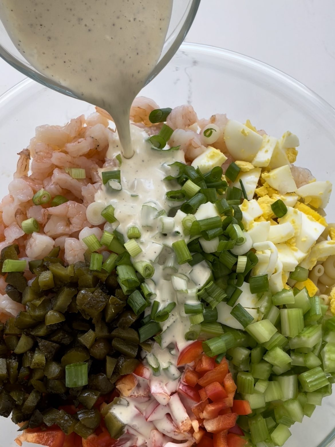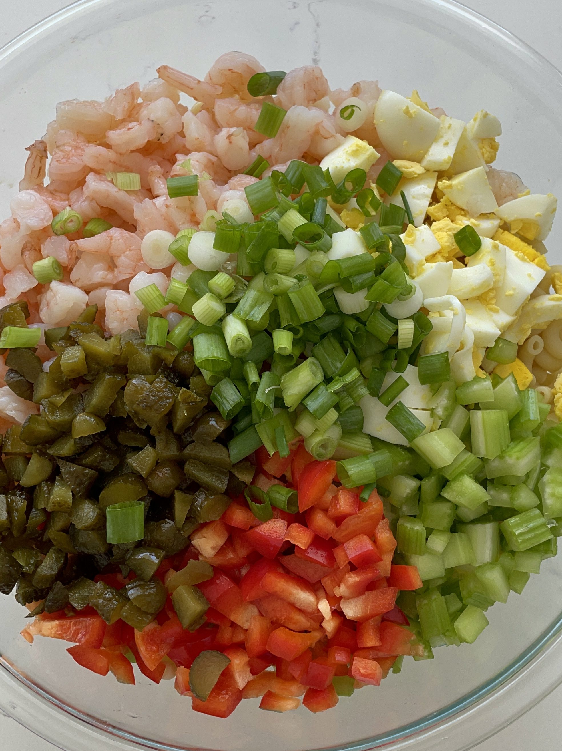 Add the pasta to a large bowl with the chopped shrimp, celery, red pepper, green onions, pickles, and eggs.