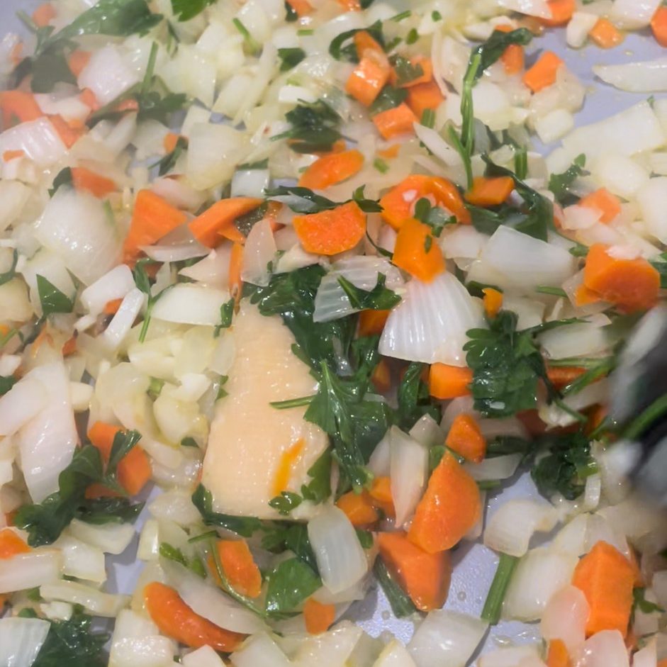 In a large sauce pan heat the extra virgin olive oil over medium heat. Add the onions, garlic, and carrots. and cook about 6-8 minutes, stirring regularly until softened.