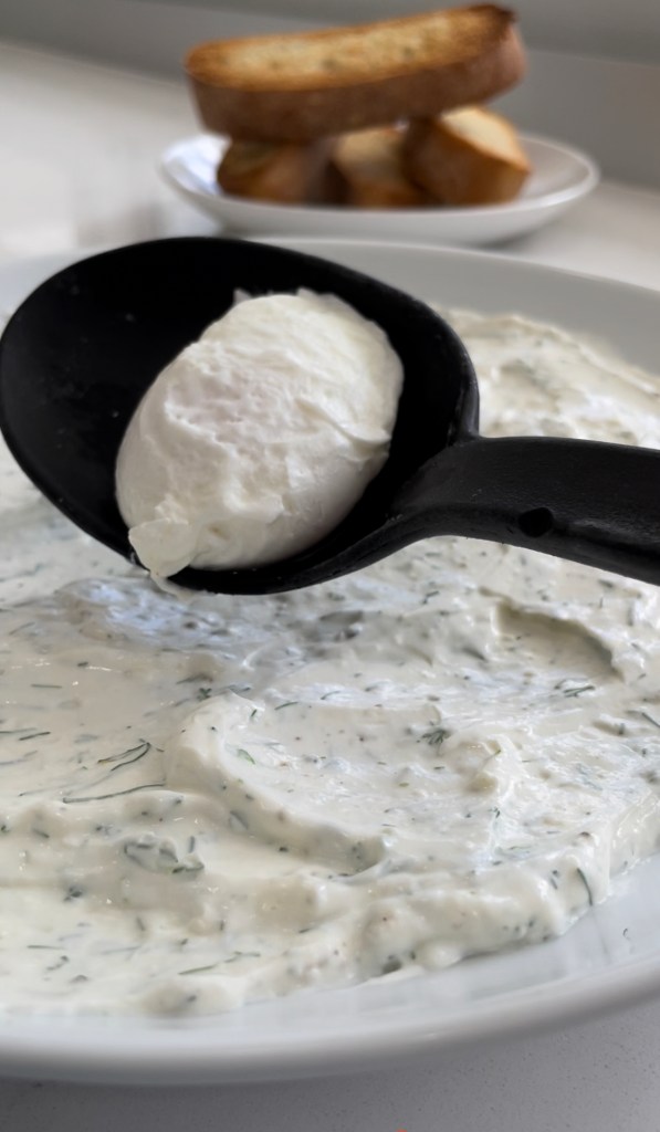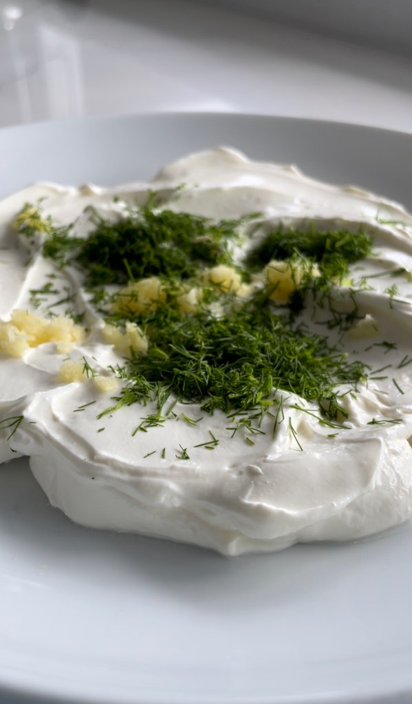 Choose your serving dish and combine the yogurt, dill, garlic, and salt and pepper in the center of the dish. Spread it out to cover your serving dish. Set aside to marinate in the fridge while you prepare the rest of the dish.