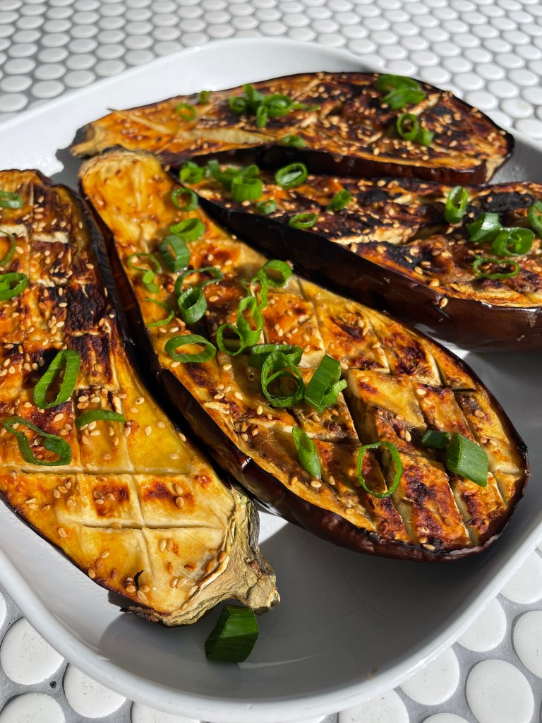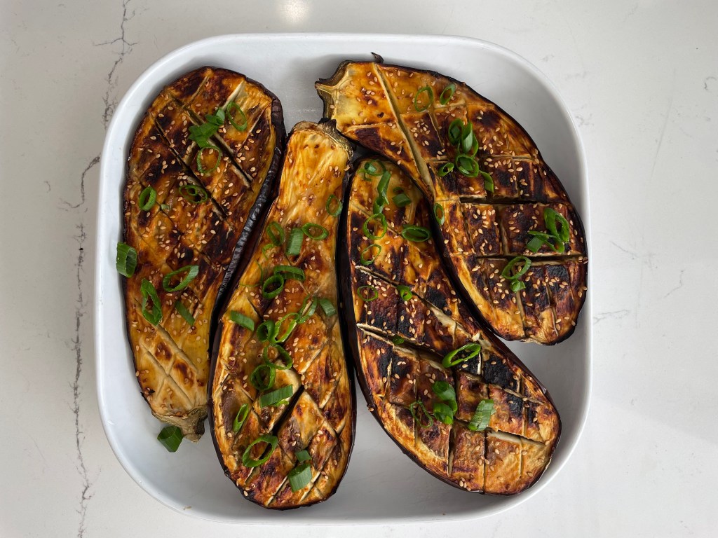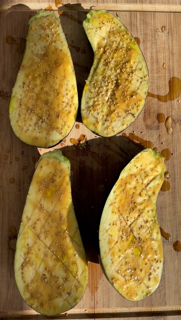 I’m a small bowl mix together MiSOgood white miso, sesame oil, water, vinegar, garlic, ginger and sesame seeds. Brush the eggplants with the miso mixture. Reserve a little of the sauce for basting the eggplants during cook time.