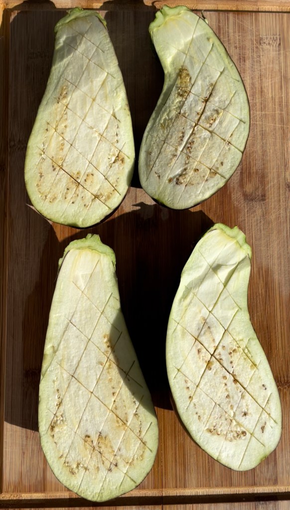 Cut eggplants in half lengthwise. Then using the tip of a small knife make diagonal cuts though the fleshy parts of the eggplant in a diamond or crosshatch pattern, making sure not to cut all the way though to the skin.