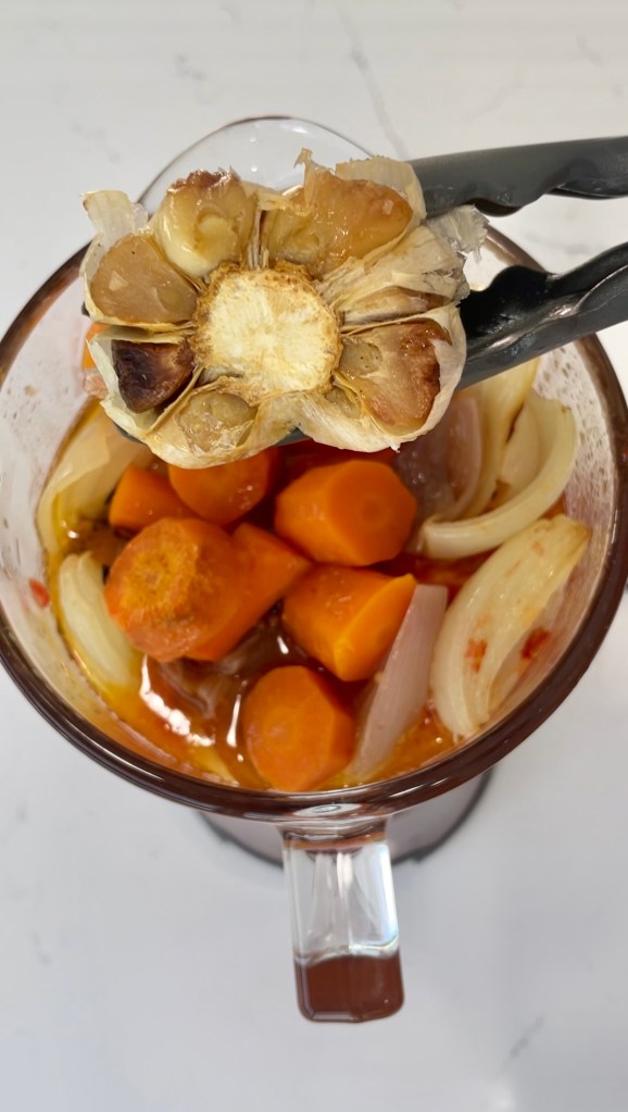 Transfer everything to a blender except the garlic. Carefully unwrap the foil that is enclosing the garlic and squeeze out the gloves into the blender (I do this using the middle of 2 thongs to squish the garlic gloves out easily. Add a few pinches of salt, vegetable stock and the fresh basil. If you wish to make it creamy, add in 1/4 cup of heavy cream or just skip this step and keep it vegan!