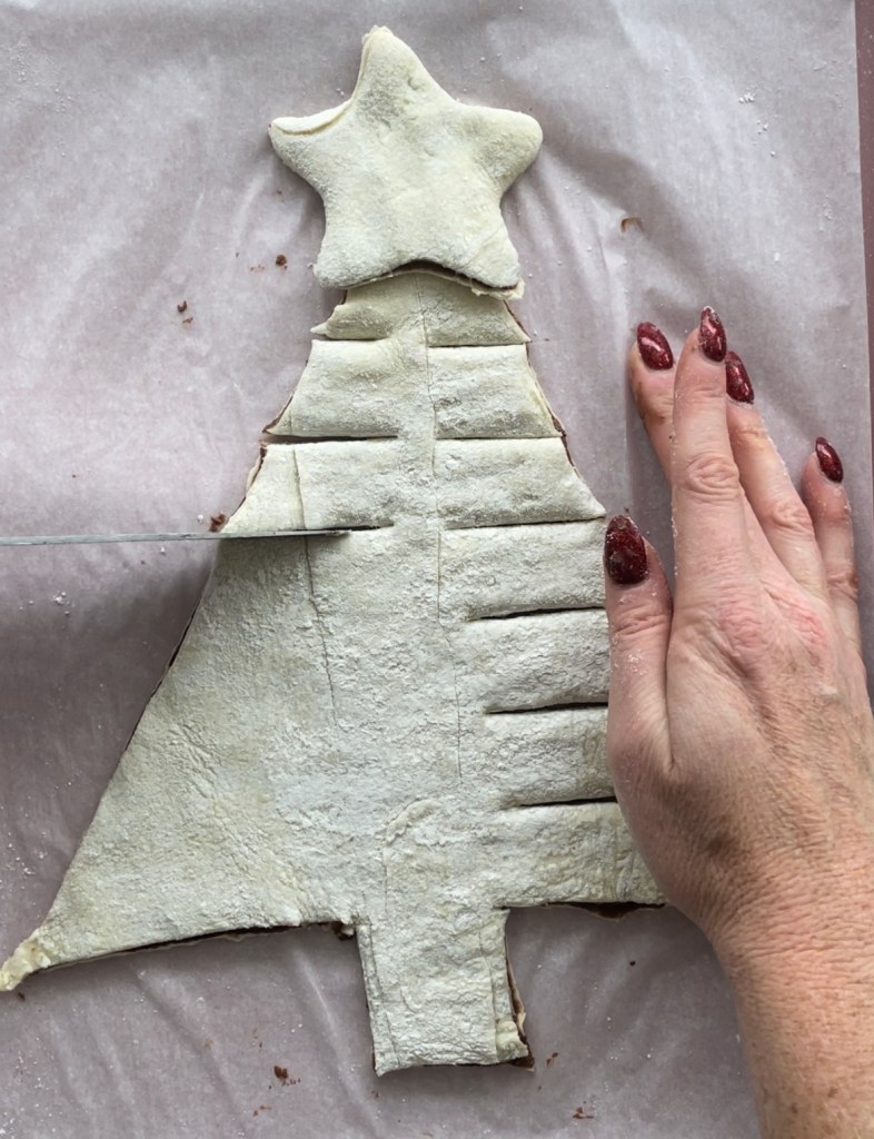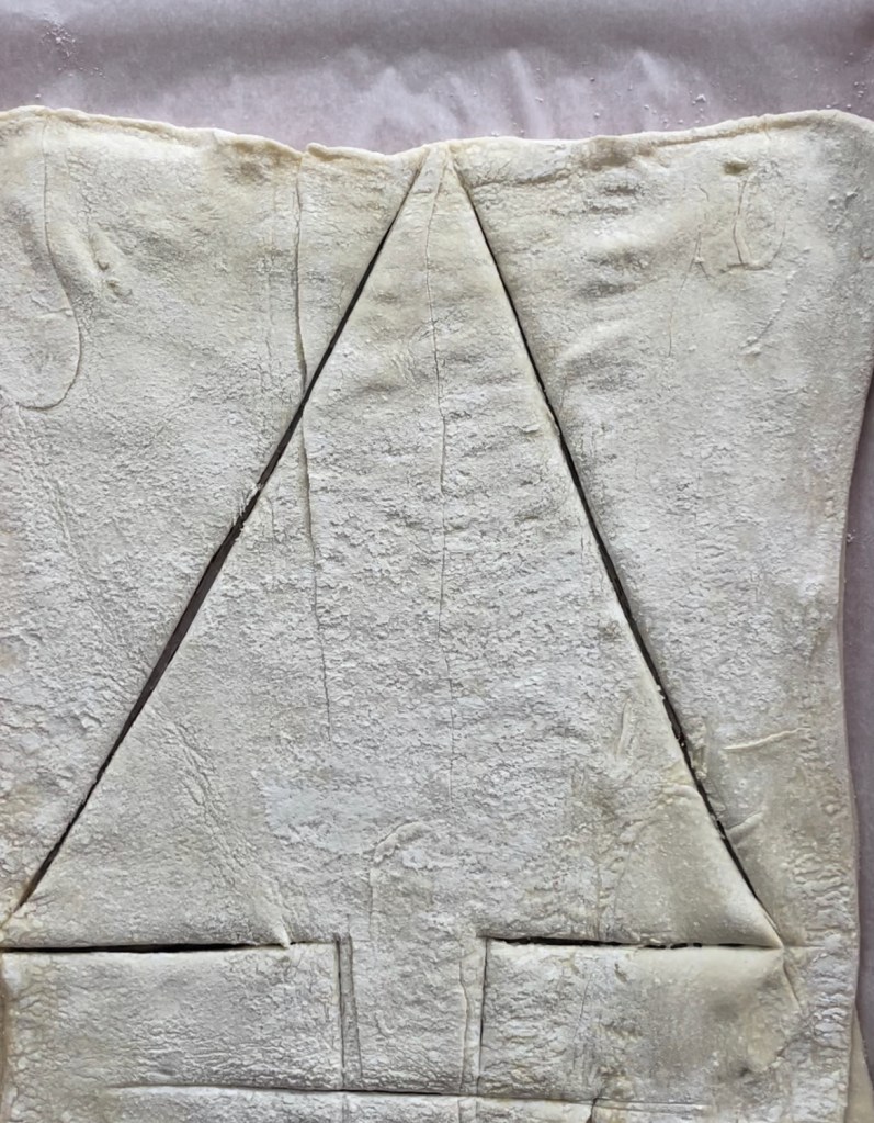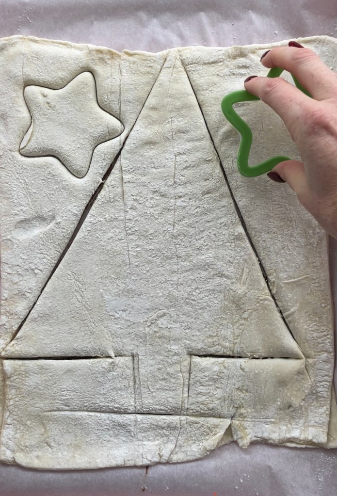 Now let’s cut out the tree & shapes! Use a knife to cut though pastry and make 2 sides of the triangle/Christmas tree shape. When cutting the bottom side, don’t cut all the way across, instead cut out a tree trunk shape. Use your star cookie cutter to cut out 1 star for the top of the tree. Any remaining pastry scraps can also be cut into star shapes.