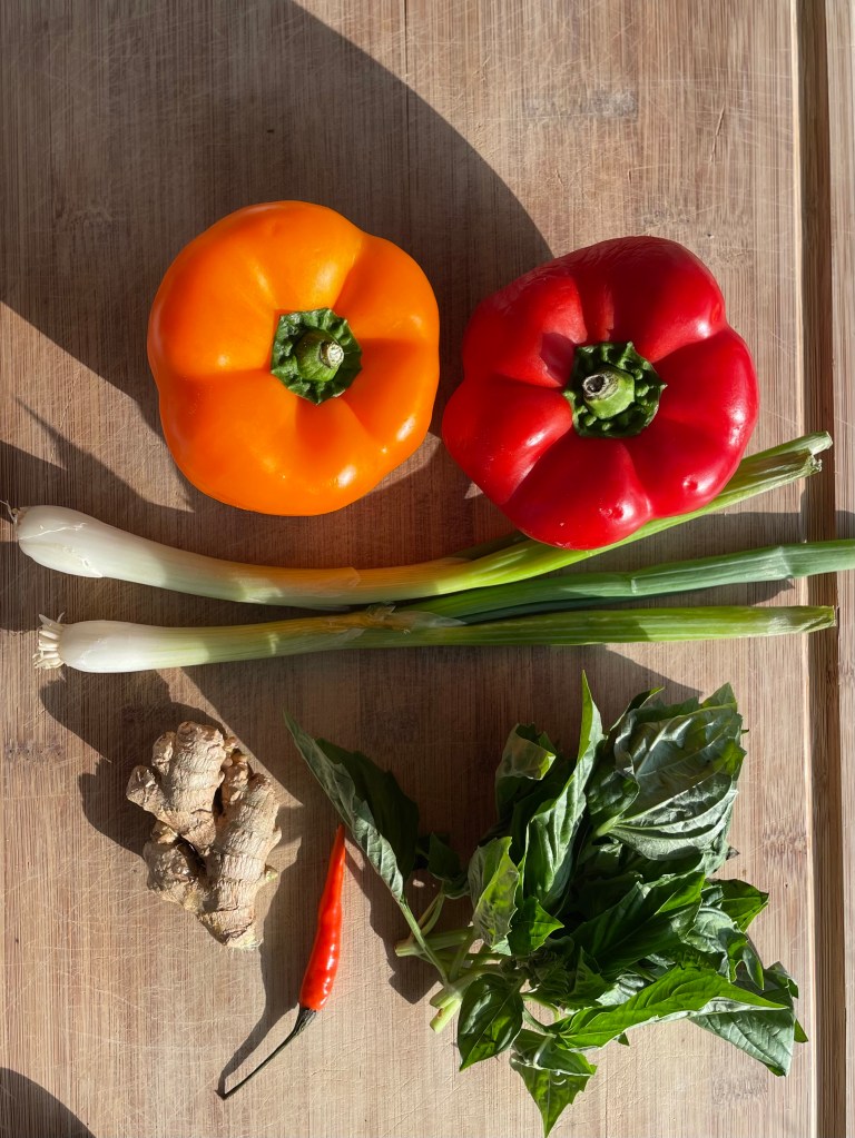 Prepare veggies by slicing peppers and green onion, grating ginger and chopping basil.