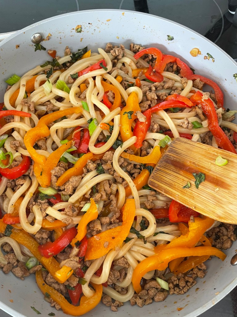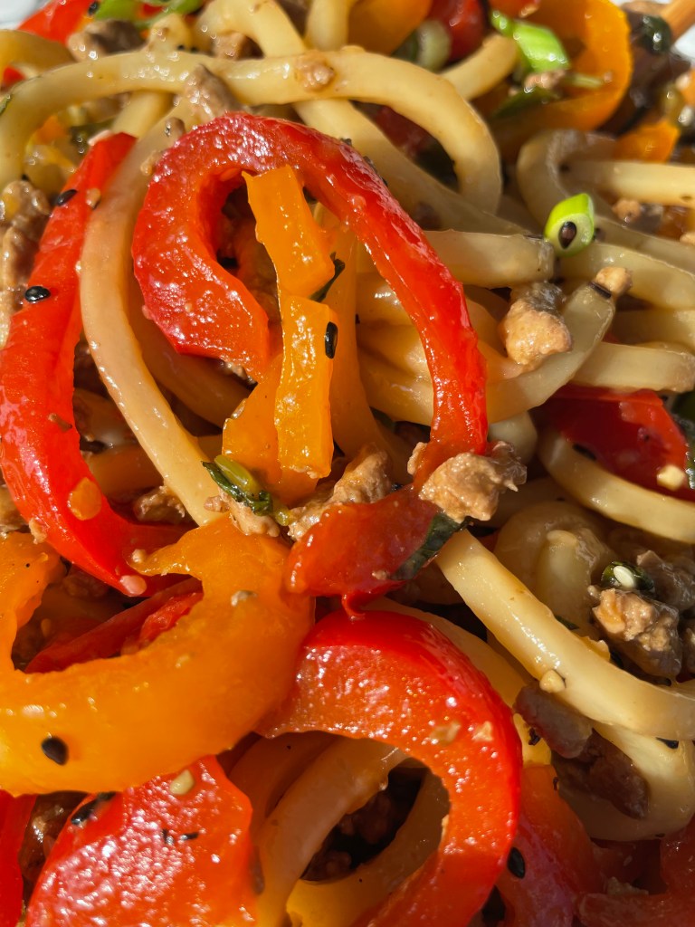 Saucy noodles are my comfort food. If you love noodles as much as me, you have to try this easy Stir-Fried Udon Noodle recipe! Perfect for any night, this sweet soy and basil sauce recipe can be made in under 20 minutes. All you need are chunky udon noodles, peppers, ground turkey—and your favorite veggie and/or proteins.