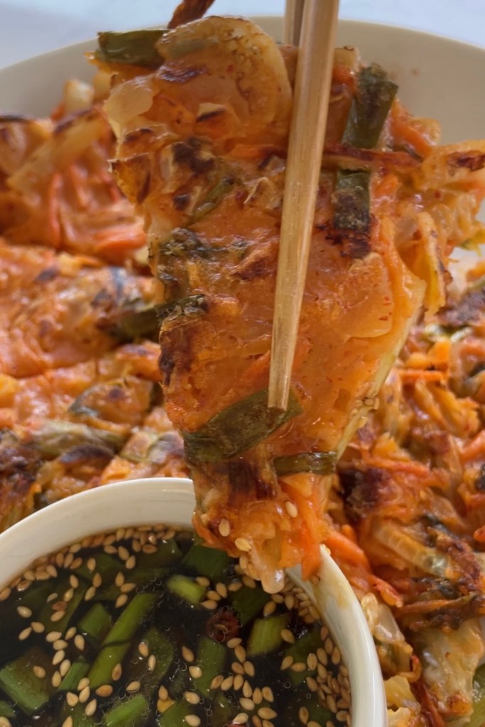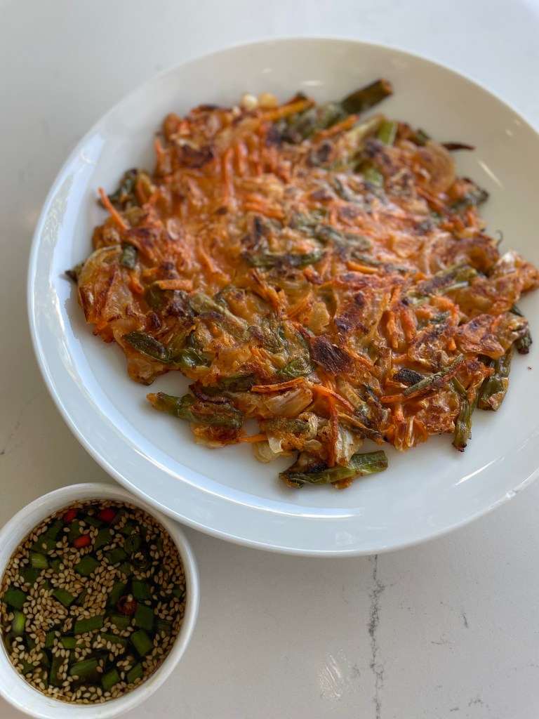 These savory Korean-style veggie pancakes are packed with kimchi, veggies and umami flavor. Plus, it’s paired with a Saucy Ginger-approved sauce that’s both slightly sweet and salty. My recipe is a mix of my two favorites savory pancakes: scallion and kimchi. The best part: you can easily customize which vegetables to add to this dish (keep reading).
