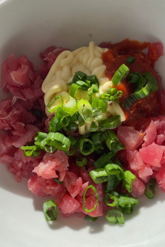 Prepare spicy tuna by finely chopping tuna on a cutting board. Transfer tuna to a small bowl. Add to the bowl Kewpie mayonnaise, Sriracha, soy sauce, sesame oil, and lime juice and chopped green onion. Stir to combine.