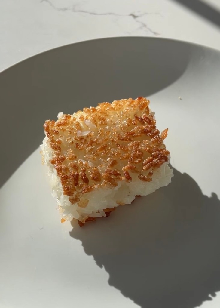 In a large frying pan, heat 4 tablespoons of vegetable oil on high heat. Once the oil is hot, gently place your rice squares into the pan. Cook rice squares in batches making sure not to overcrowd the pan. Cook approximately 2-4 minutes on both sides flipping half way through when the color of the bottom is golden brown. After you flip over rice, add 2 tablespoons of additional oil to the pan as needed to maintain the oil level for frying. When your rice squares are fried on both sides transfer to a rack to cool and maintain crispiness.