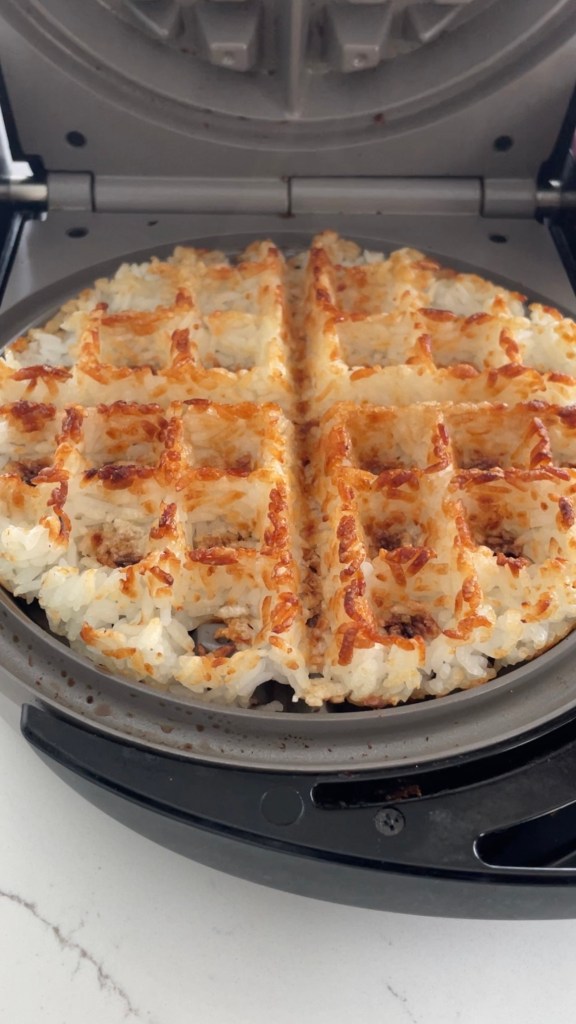 Preheat your waffle maker for 2 minutes or until hot. Add cooked and seasoned rice to the waffle maker and press the rice down firmly. Close and cook 4 minutes on each side, 8 minutes total until golden-brown.