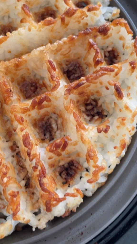 This is deceiving simple to make and tastes just like your favorite sushi roll. Just add rice to a pre-heated waffle maker, press the rice down a bit to ensure you are filling in the waffle shape, close and cook until golden-brown.