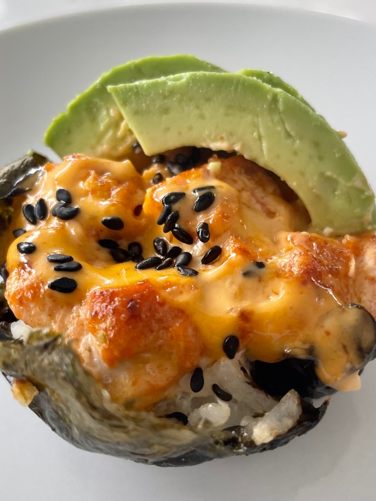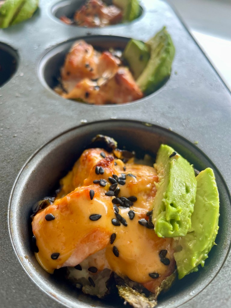 Here’s another viral recipe you have to try. Baked salmon sushi cups are a creamy and delicious treat filled with salmon, spicy mayo, sushi rice and the bottom layer is a square of nori seaweed paper- just like sushi! I topped these sushi cups with creamy avocado, more spicy mayo and sesame seeds. These are perfect two-bite serving portions you could serve as appetizer, as a portable lunch or for dinner.