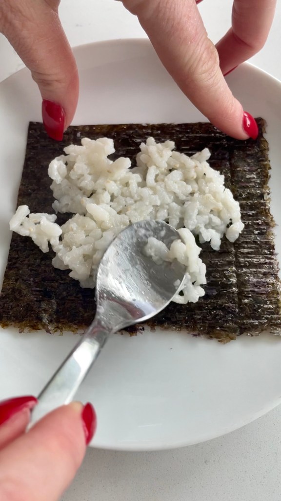 Cook sushi rice according to package instructions. While the rice is still hot, slowly pour the seasoned rice vinegar over the back of a wooden spoon into the rice. Fold the vinegar into the rice gently.
