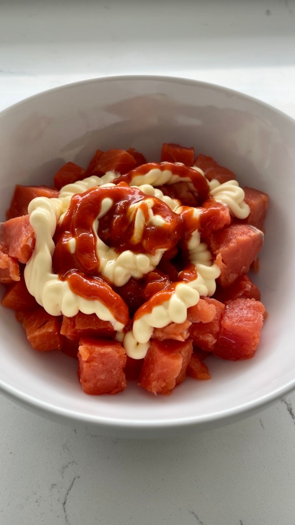 Add cubed and prepared salmon to a small bowl along with a pinch of salt, Japanese mayo, sriracha and sesame oil. Cover and let marinate in the fridge for 10 minutes.