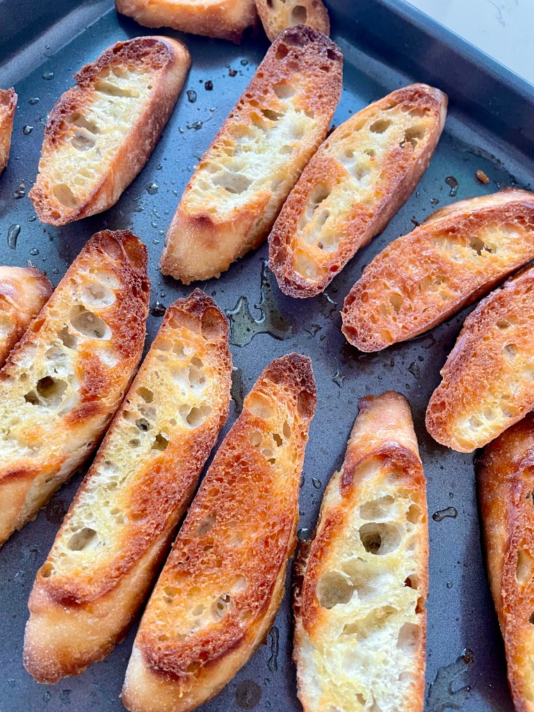 Preheat oven to 400°F. Slice a baguette diagonally. Place on a metal baking tray and cover both sides with a generous amount of olive oil. Toast approximately 15-20 minutes, flipping half way until deep golden brown. Enjoy!