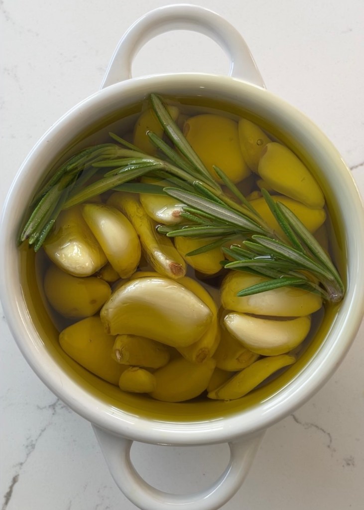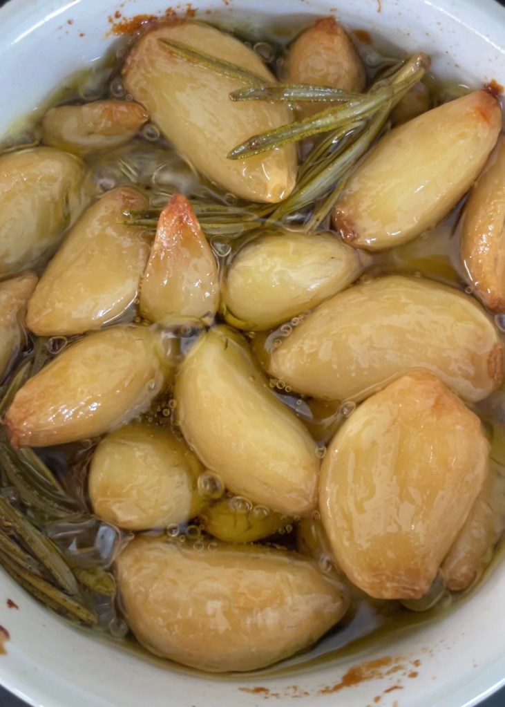 Add peeled garlic cloves to a mini baking dish about 3/4 of the way to the top, then cover with enough olive oil to completely submerge the garlic. Add 1 fresh rosemary spring.