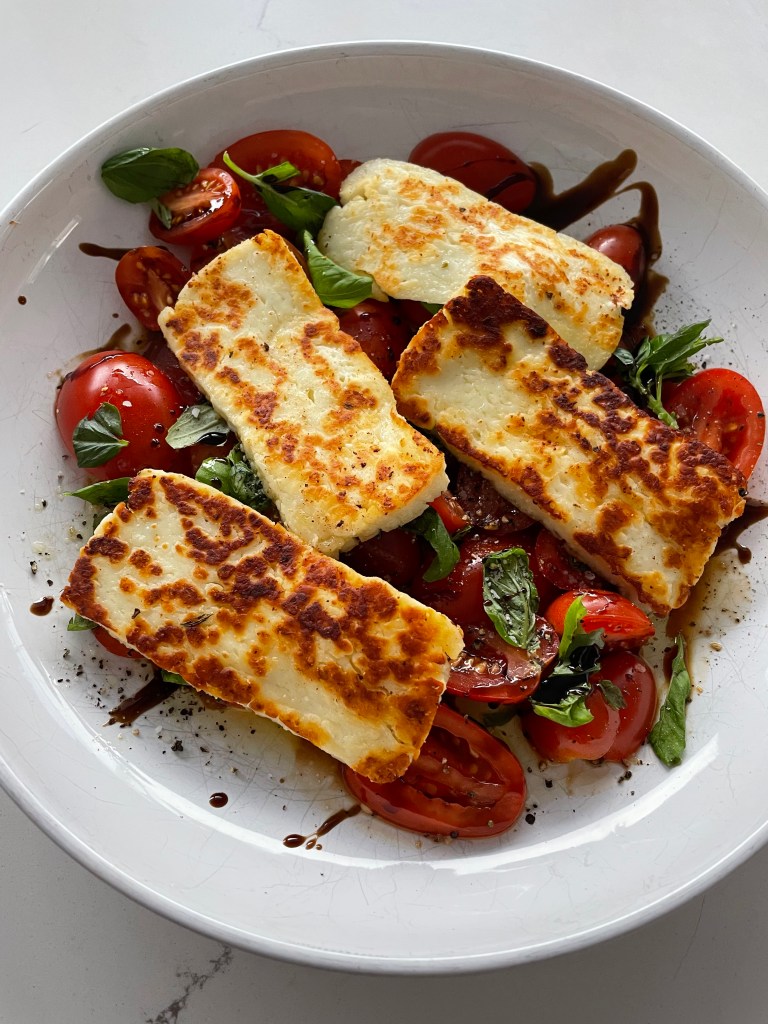 Plate the pan-fried halloumi over the fresh tomatoes and basil and serve!