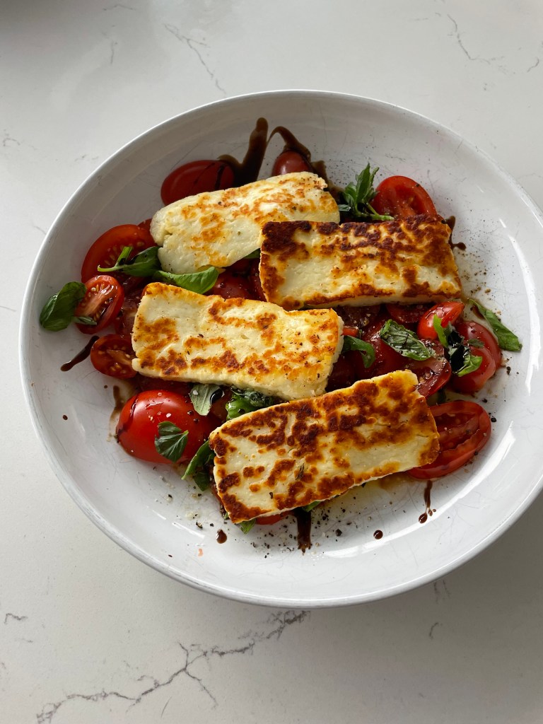 Who doesn’t love fried cheese? This is a simple, anytime appetizer (or snack) that can be whipped up in under 5 minutes. In this recipe, pan-fried halloumi is served on top of a fresh cherry tomato and basil salad and dressed with balsamic glaze and EVOO.