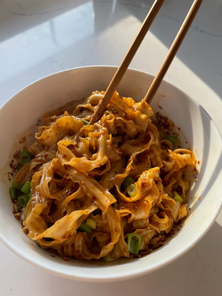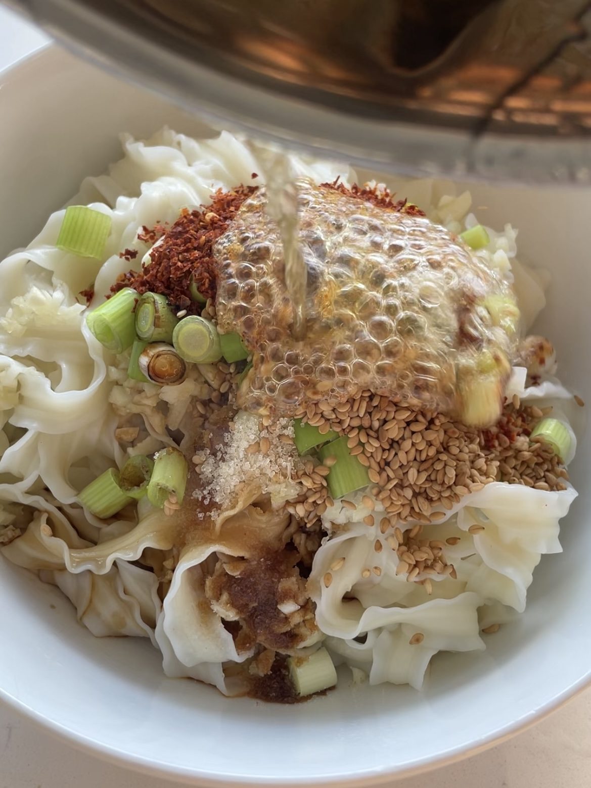 Top noodles with garlic, chili flakes, toasted sesame seeds and the white parts of green onion. Add to the side of the bowl the dark soy sauce, light soy sauce, chinese black vinegar, sesame oil salt, and sugar.