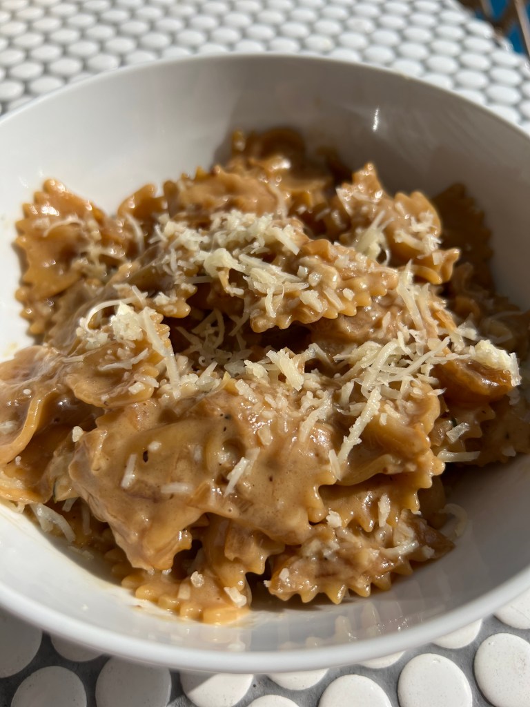 This creamy, savory pasta dish was inspired by the flavors of a comforting bowl of french onion soup! You start by caramelized onions to add depth of flavor, then add wine, sherry or brandy, broth, seasonings, and uncooked pasta to the pan. Simmer until al dente, add in cream and top with gyueyre cheese. And the best part – everything comes together in just one pan for the easiest cleanup ever!