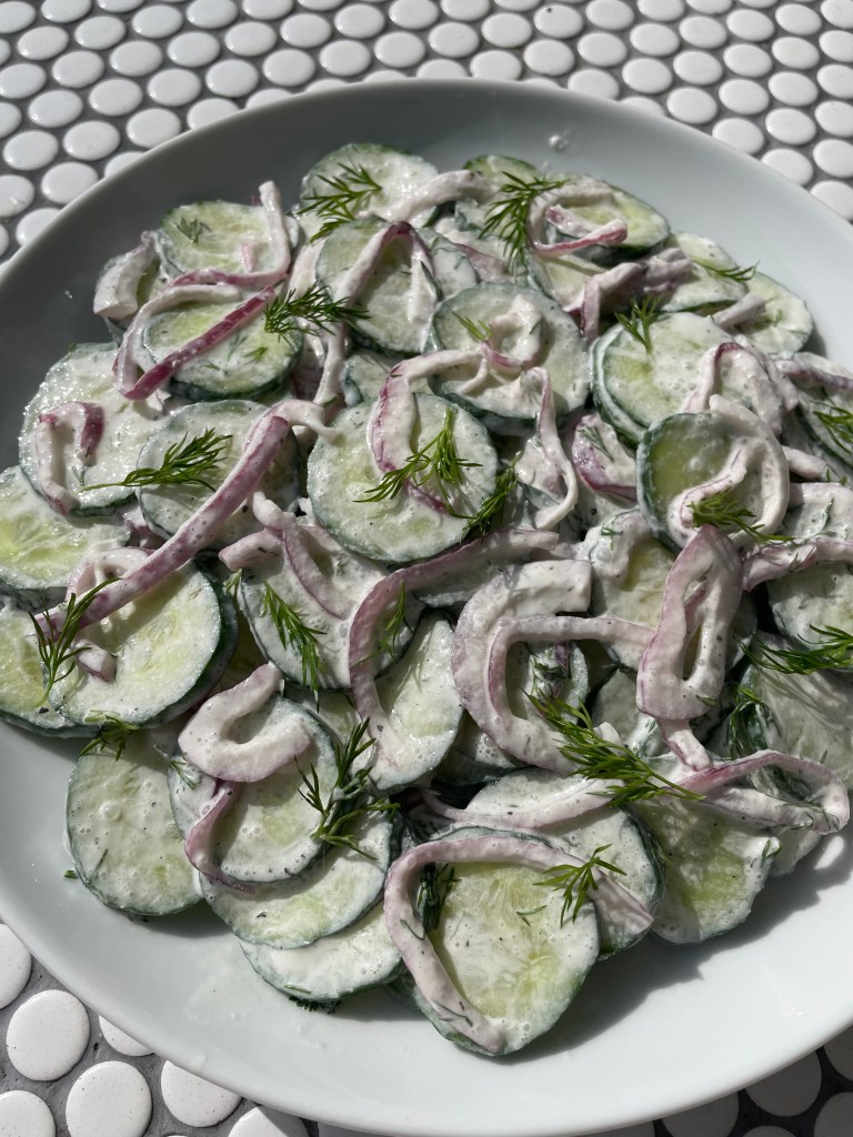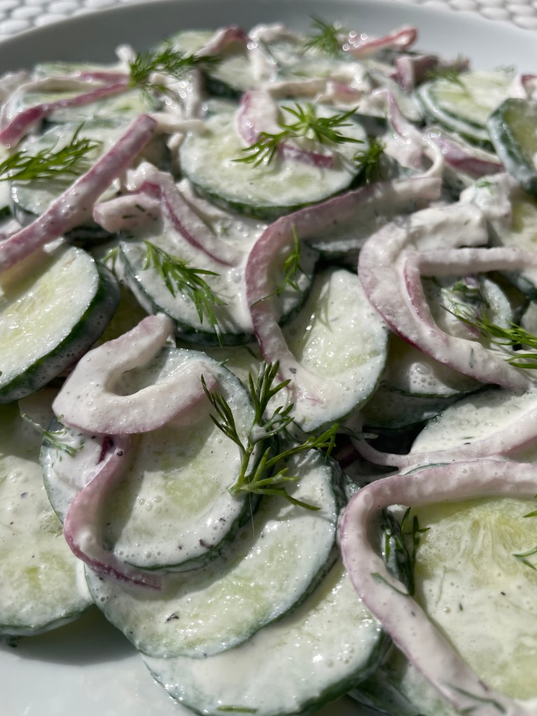 Fresh cucumber, red onions, and dill come together in a sour cream and vinegar dressing in this refreshing, creamy and tangy, side-dish. Perfect on a hot day, this salad can be made ahead of time and can be chilled until ready to serve. Enjoy with burgers and hotdogs, bbq meats, potato and pasta salads.