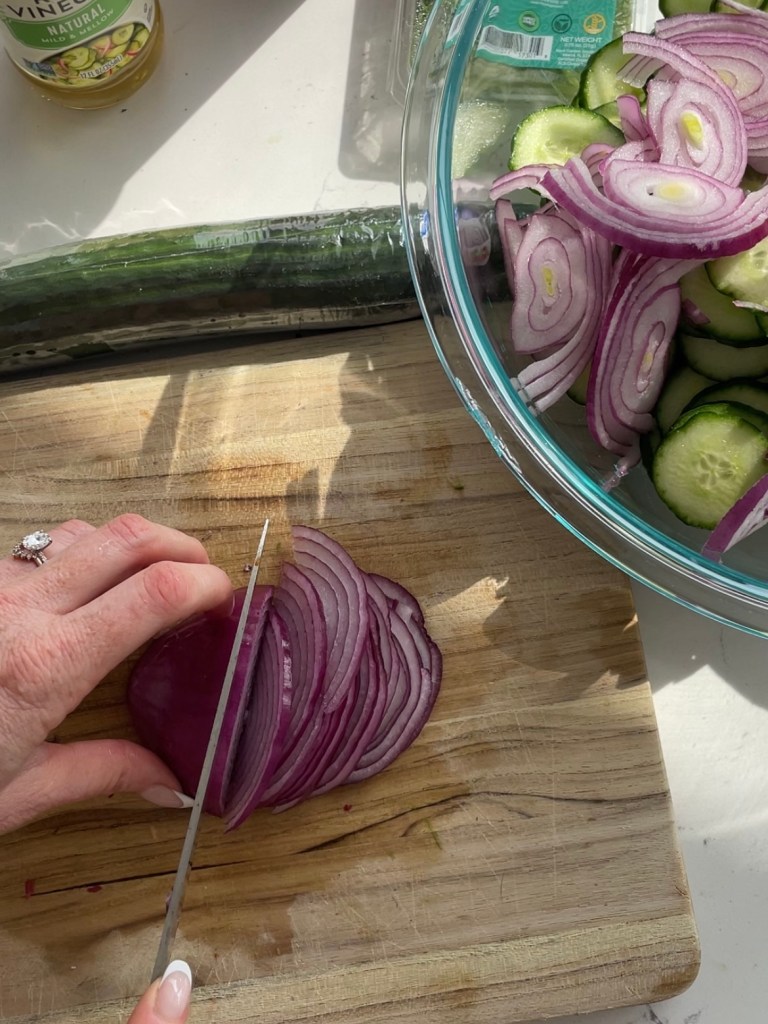 Thinly slice cucumbers and onions and add to a large bowl. Top with chopped dill.