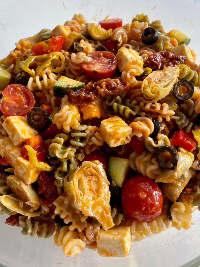In a large bowl, add cooled pasta, all pasta salad ingredients and the blender tomato vinaigrette. Toss to coat evenly in the dressing and cover with plastic wrap. Place in the fridge for at least 30 minutes to chill before serving.