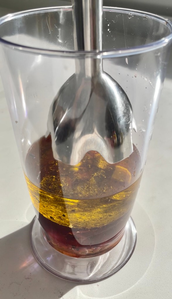 Add all ingredients for the blender tomato vinaigrette into a blender or blender cup. Using a traditional blender or an immersion blender, blend until smooth.