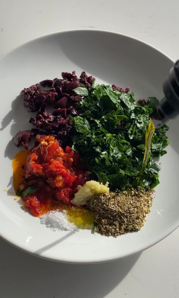 Combine all ingredients in shallow dish or plate and stir to combine. Serve with warm, toasty, crusty Italian bread & enjoy immediately!
