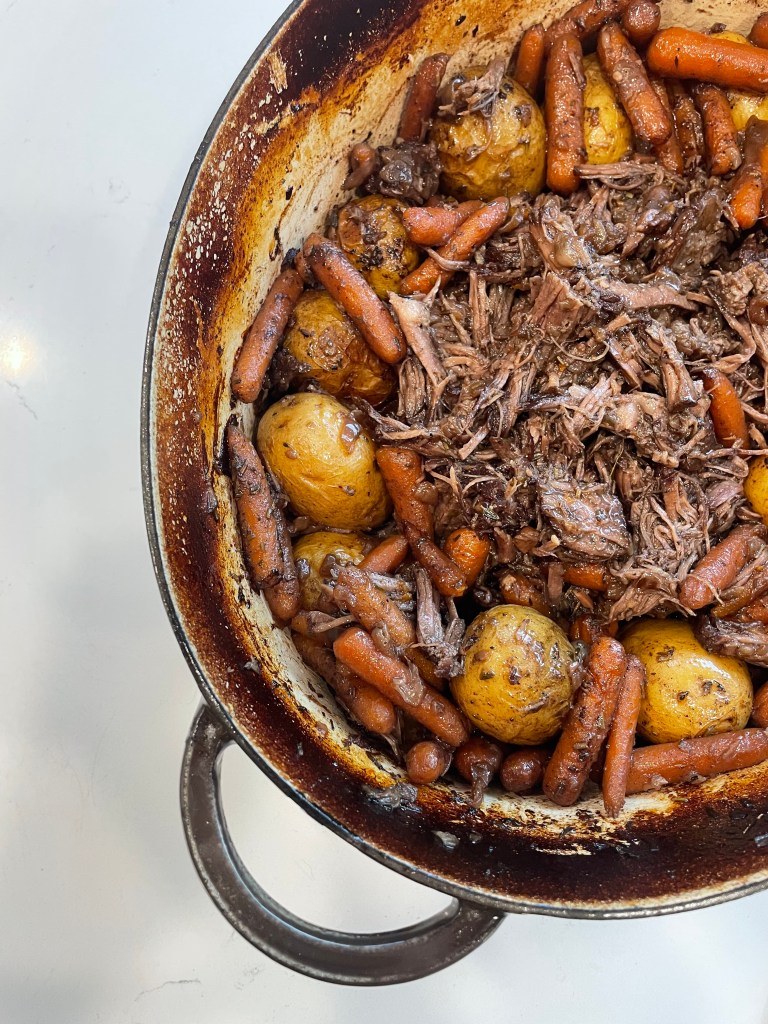 Return the seared meat to the pot, along with any juices. The liquid should cover at least half of the meat. If not, add more beef broth as needed. Place the potatoes and carrots on top. If desired, season the vegetables with a touch more kosher salt. Cover the pot with a lid and cook at 400°F for 2 hours and 45 minutes, or until the meat easily pulls apart with a fork. For even greater tenderness, cook for an additional 15-30 minutes. Enjoy!
