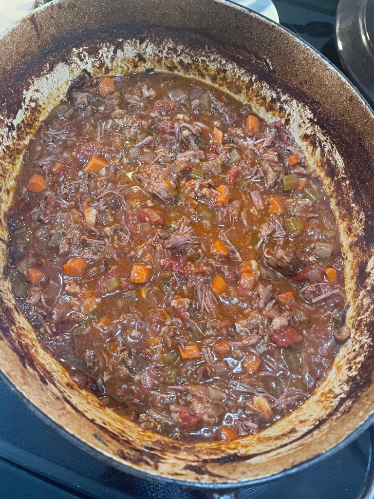 Step 7: Remove and discard bones and thyme springs. Using a ladle, skim any excess fat from the surface. Remove the short rib meat and transfer it to a cutting board. Crush any whole tomatoes left in the Dutch oven with a wooden spoon. Shred the meat on the cutting board by pulling it apart with two forks, and then add it back into the Dutch oven. Give the bolognese sauce a good stir and serve it over pasta. Enjoy your meal!