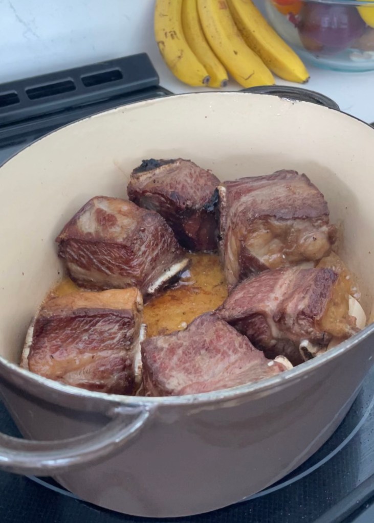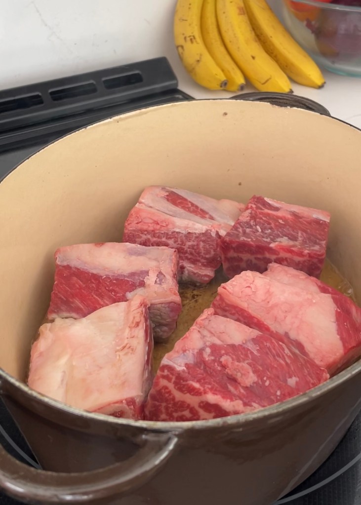 Step 3: Now, heat a Dutch oven on the stovetop over medium-high heat. Add 2 tablespoons of olive oil. Place the short ribs in the pot and sear them on all sides until a crust forms, which should take about 2-3 minutes per side. Once done, take the ribs out of the pot and set them aside.