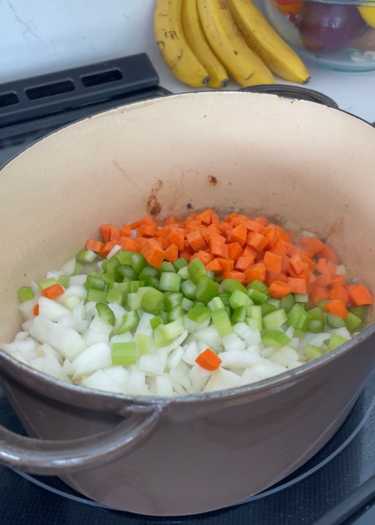 Step 4: Reduce the heat to medium. Add in the onions, carrots, and celery, and stir. Cook them until they start to release moisture and the onions turn see-through, which should take around 8-10 minutes. Add minced garlic, stir and cook for 1-2 minutes until it becomes aromatic. Then, add tomato paste and stir it into the vegetables, allowing it to cook for one more minute.