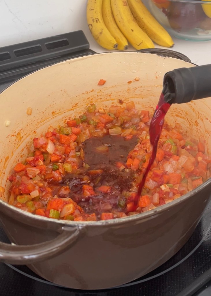Step 5: Now, add the rest of the ingredients: red wine, a can of whole peeled tomatoes, Worcestershire sauce, fresh thyme, and bay leaves. Stir everything together, and finally, add back in the short ribs along with any juices.